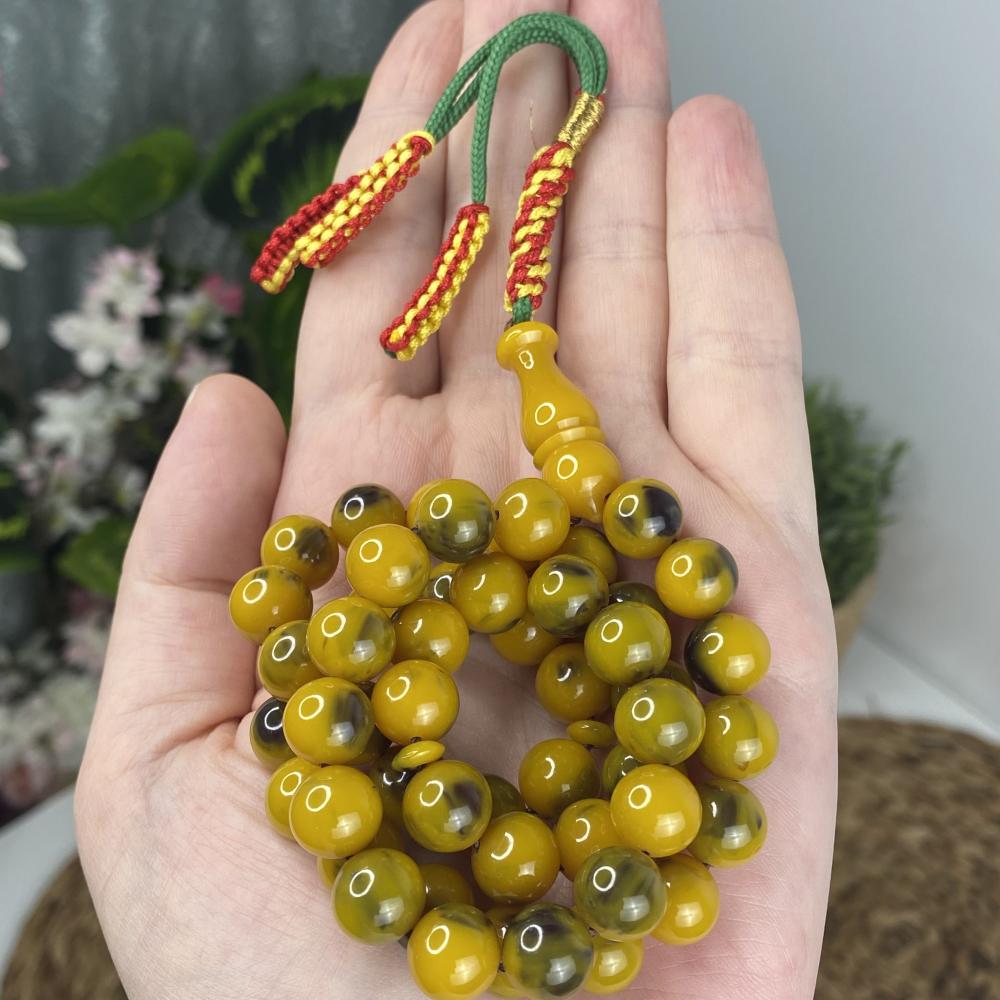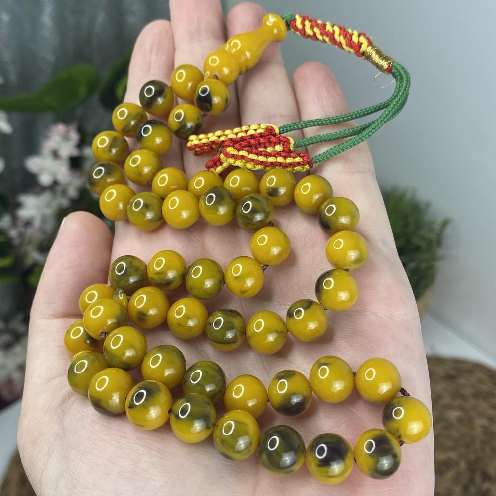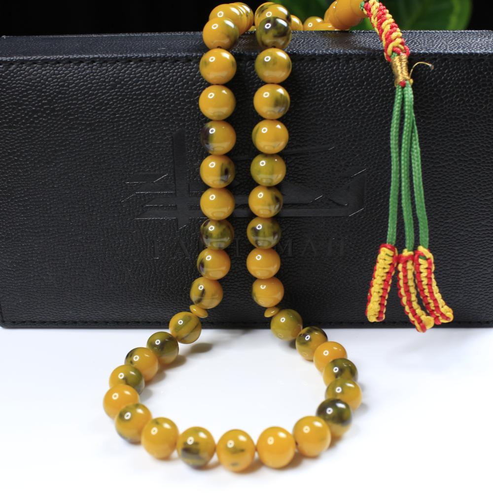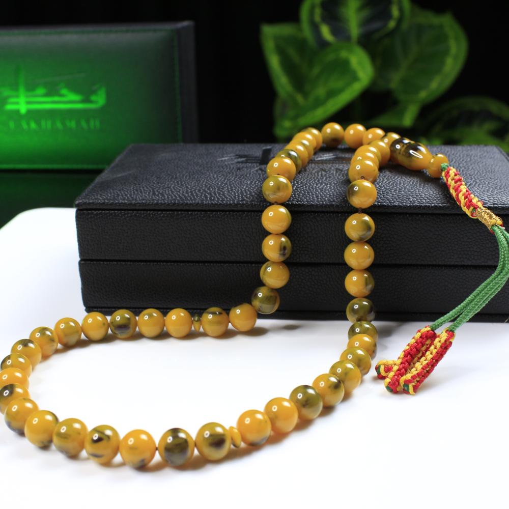 مسباح مسكي بدرجة أصفر زيتي مع بقع خضراء وتدرجات طبيعية ولمعان مصقول يمنح لمسة تراثية هادئة. خراطة يدوية متقنة وحبّات بملمس ناعم؛ قطعة أنيقة لعشّاق السبح وتليق بالإهداء والاقتناء.
