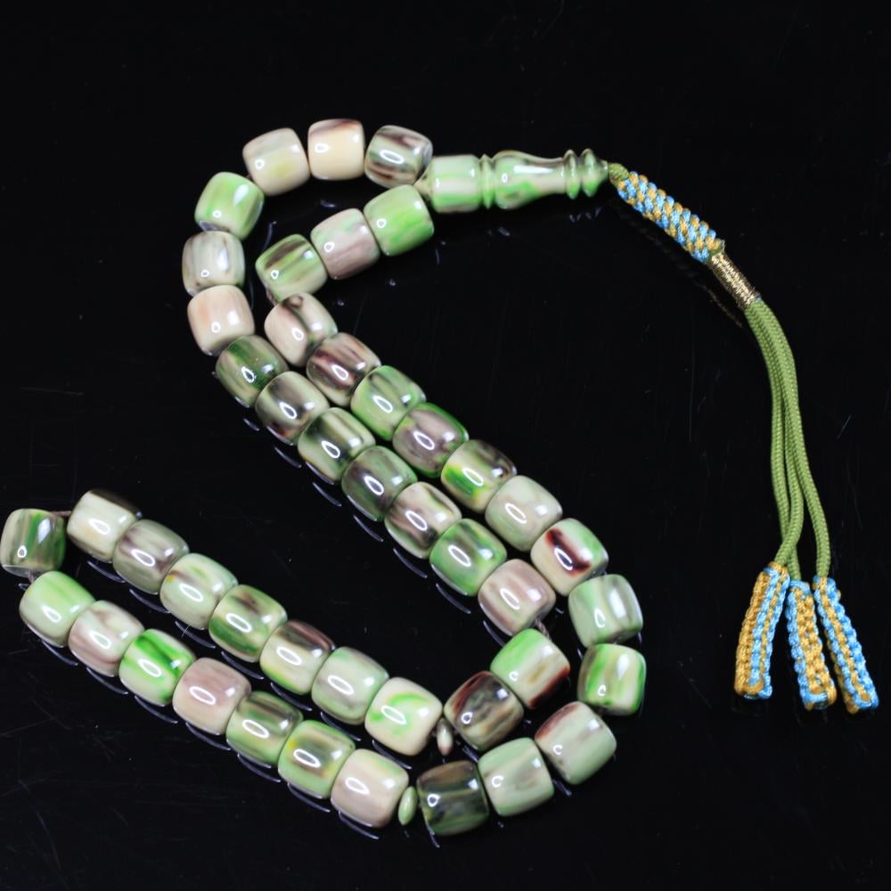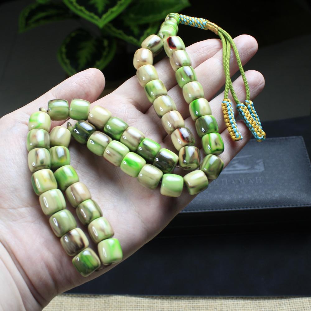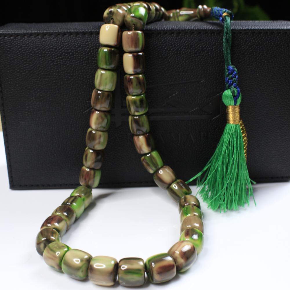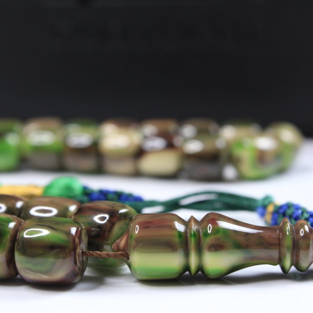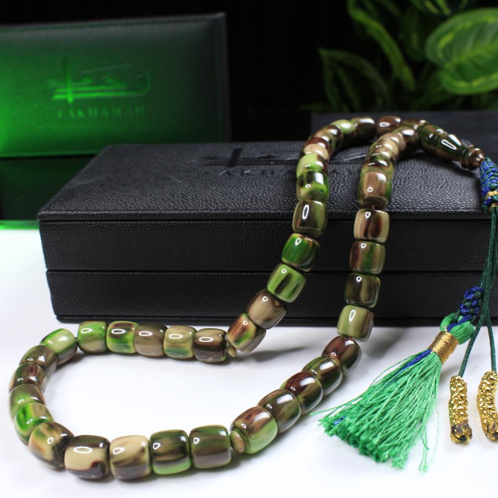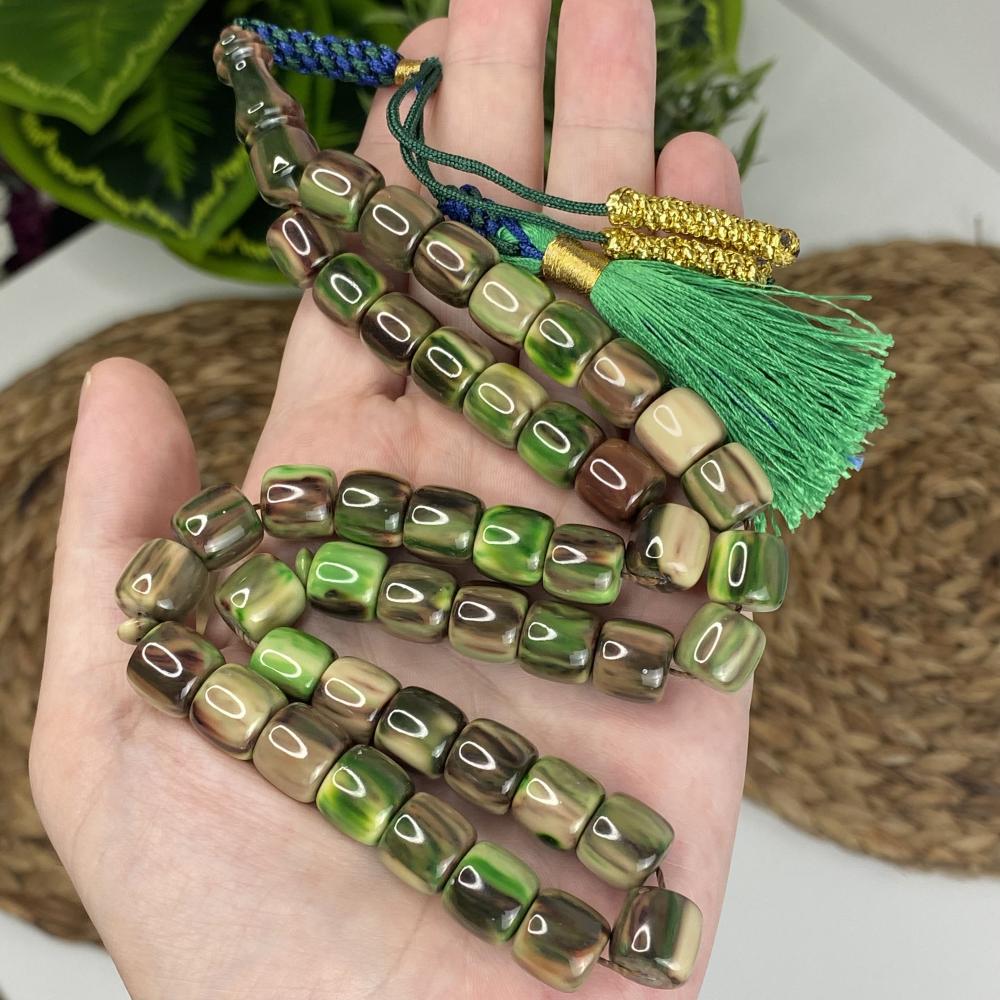 مسباح مسكي بتدرّج رخامي يجمع الأخضر العشبي مع خطوط بنية وكريمية ولمعان راقٍ يمنح عمقًا وهدوءًا بصريًا. خراطة يدوية متقنة وحبّات أسطوانية بانسيابية مريحة؛ قطعة أنيقة لعشّاق السبح وتليق بالإهداء والاقتناء.