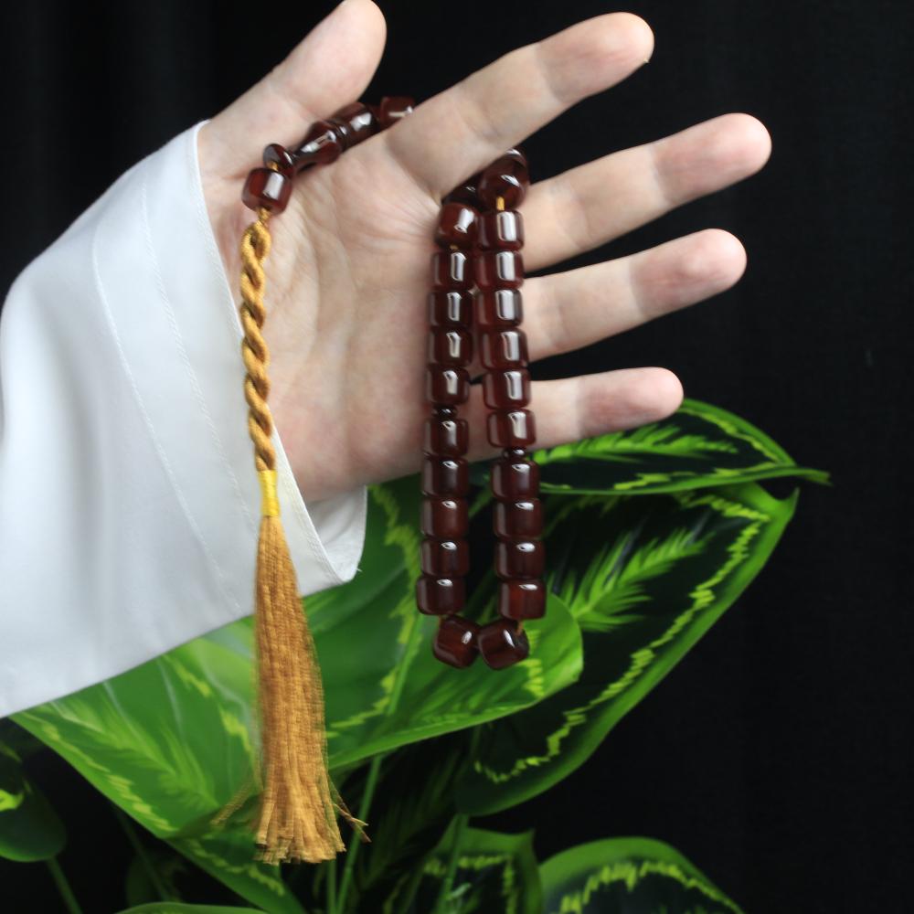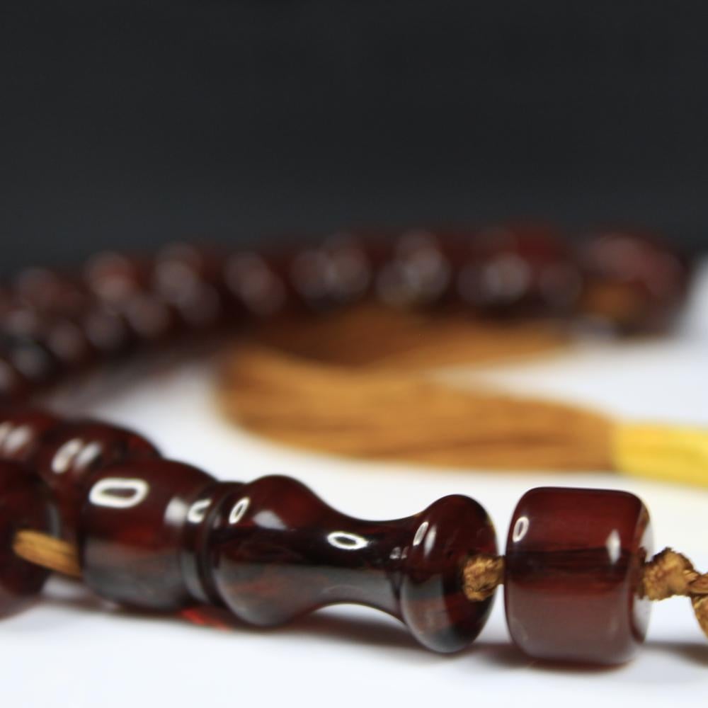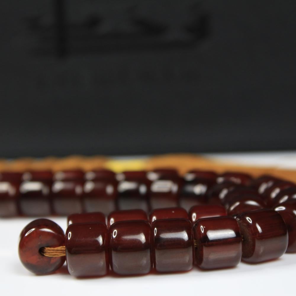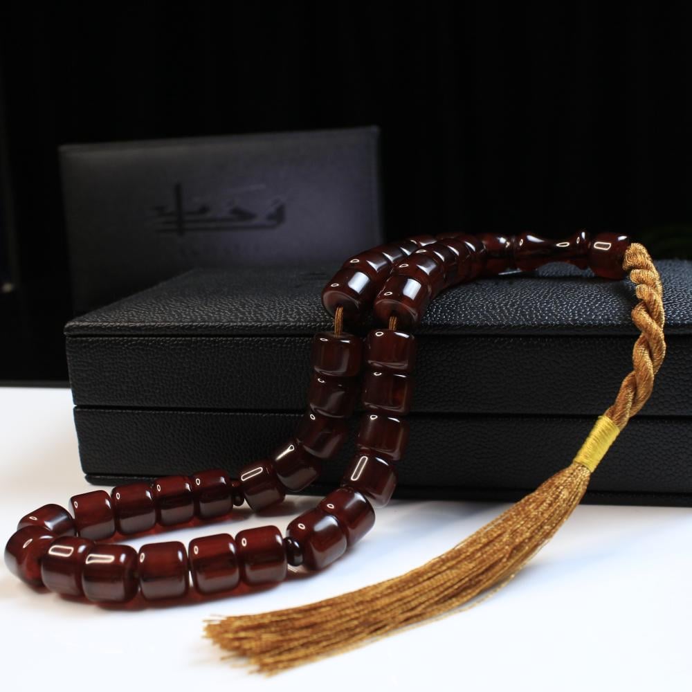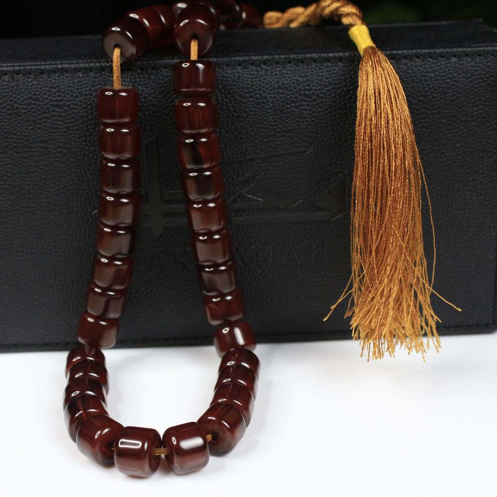سبحة مسكي فاخرة بلون بني معتّق، مصقولة بخراطة متقنة على شكل برميلي أنيق. تتميز حباتها الاسطوانية بملمس ناعم وكركوشة قطنية أنيقة، مما يجعل هذا المسباح خيارًا مثاليًا لهواة السبح أو كهدية ذات طابع فخم.