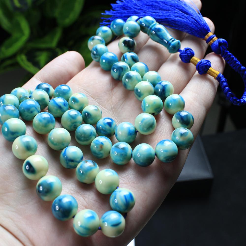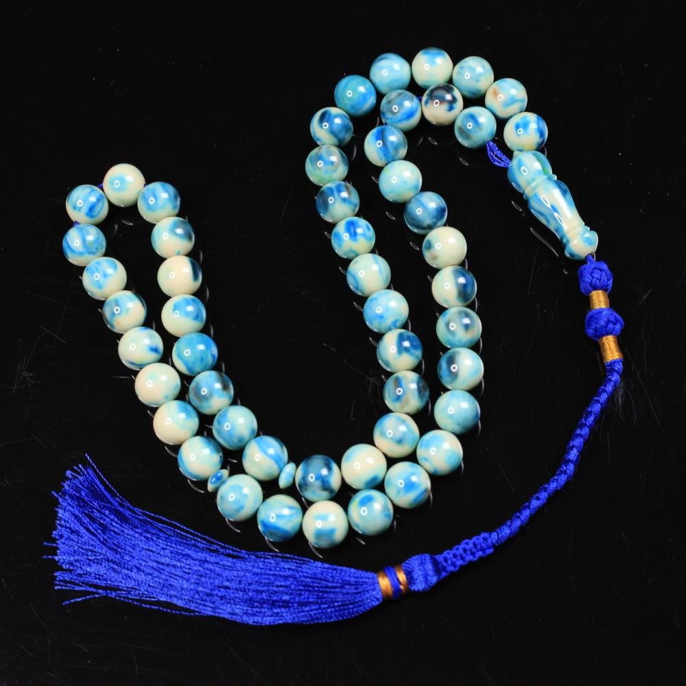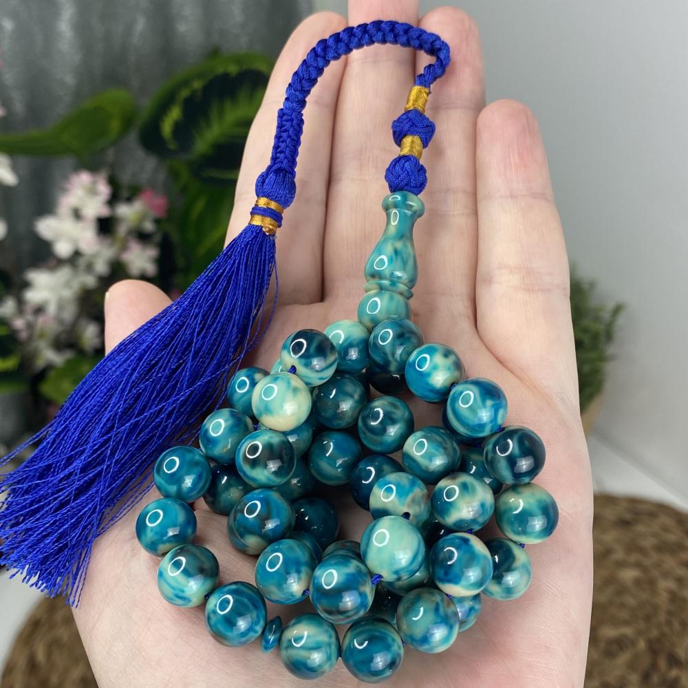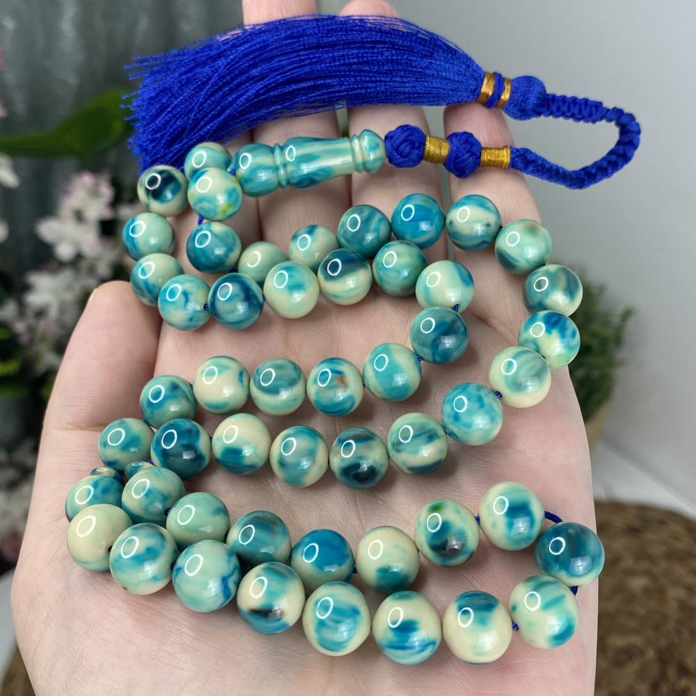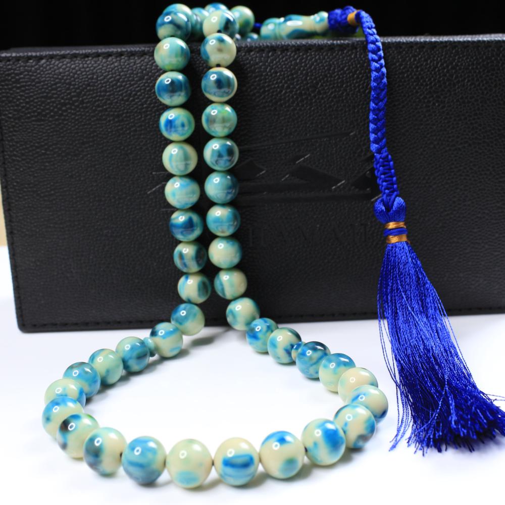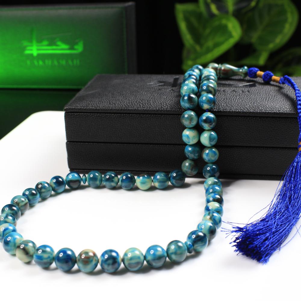 مسباح مسكي بتدرّجات تركواز تميل إلى الأزرق البحري ممزوجة بالأبيض بطابع رخامي هادئ ولمعان راقٍ يمنح عمقًا وهدوءًا بصريًا. خراطة يدوية متقنة وحبّات بملمس ناعم؛ قطعة أنيقة لعشّاق السبح وتليق بالإهداء والاقتناء.