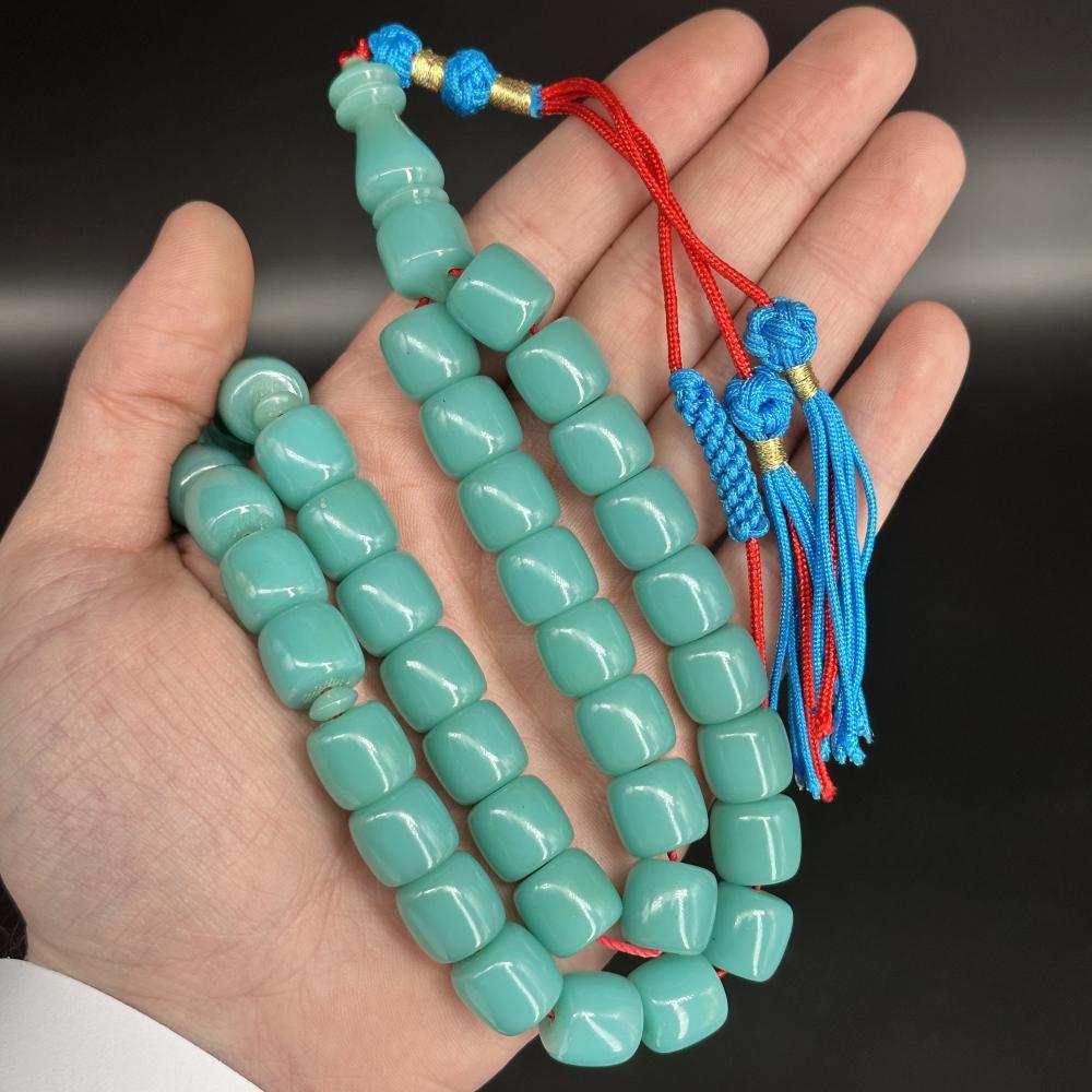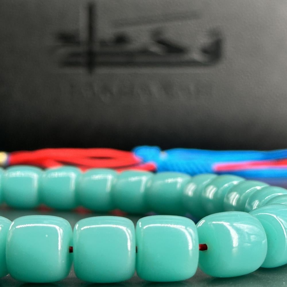 مسباح مسكي بدرجة تركواز أخضر فاتح ولمعان راقٍ يمنح هدوءًا بصريًا. خراطة يدوية متقنة وملمس ناعم؛ قطعة أنيقة لعشّاق السبح وتليق بالإهداء والاقتناء.