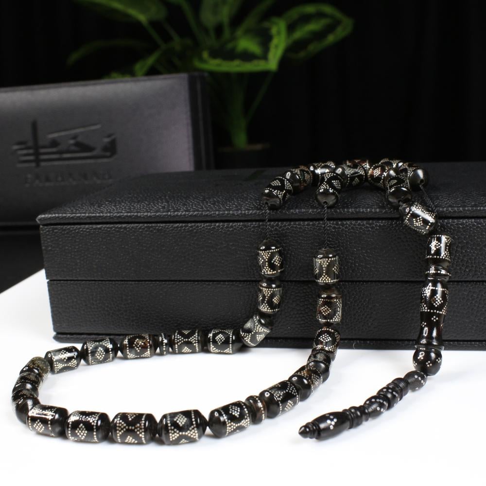 سبحة يسر فاخرة بلون أسود و مرصع بشكل حرفي بنقوش من الفضة ، مصقولة يدويًا بخراطة متقنة تُبرز تفاصيلها الراقية. تتميز حباتها البيضوية بلمسة معتّقة وملمس ناعم، ما يجعل هذا المسباح خيارًا مثاليًا للاستخدام اليومي أو كهدية ذات طابع أنيق.