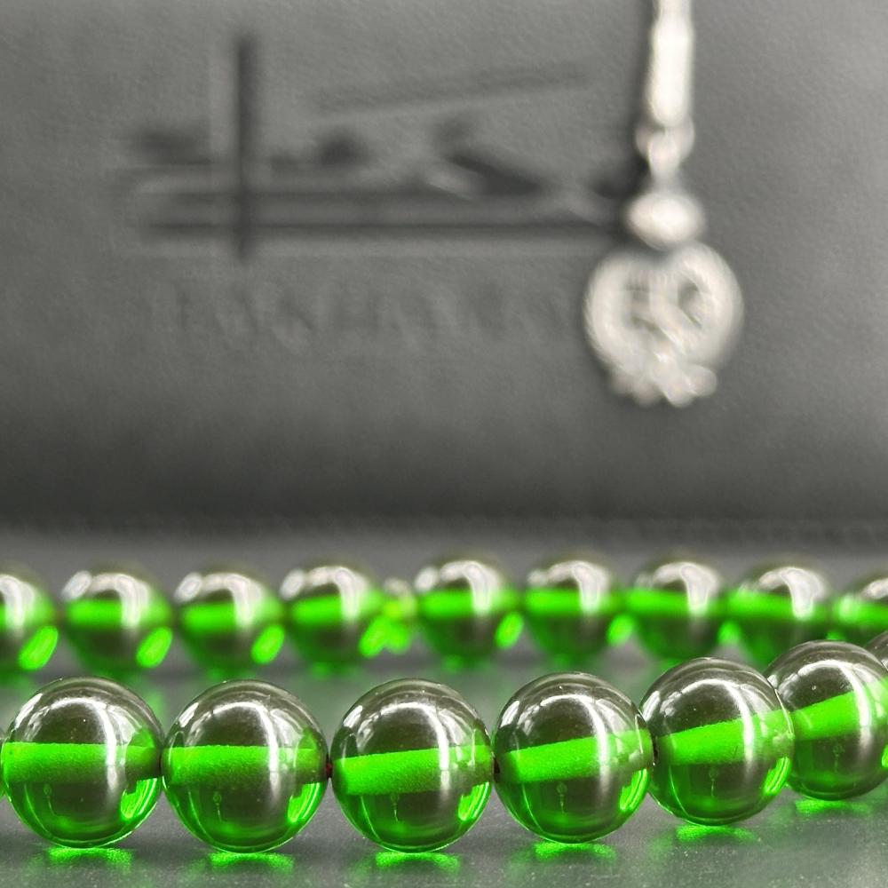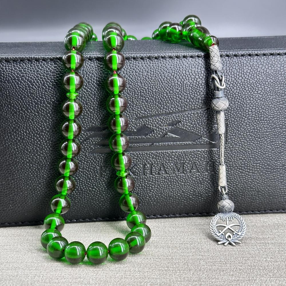 مسباح فاتوران بخرزات شفافة بدرجة اللون الأخضر ولمعان راقٍ يعكس الضوء ويمنح إحساس عمق وسكينة. تصميم أنيق وصناعة دقيقة؛ طربزونة فضة عيار 1000 تحمل شعار المملكة , قطعة لعشّاق السبح تليق بالإهداء والاقتناء.