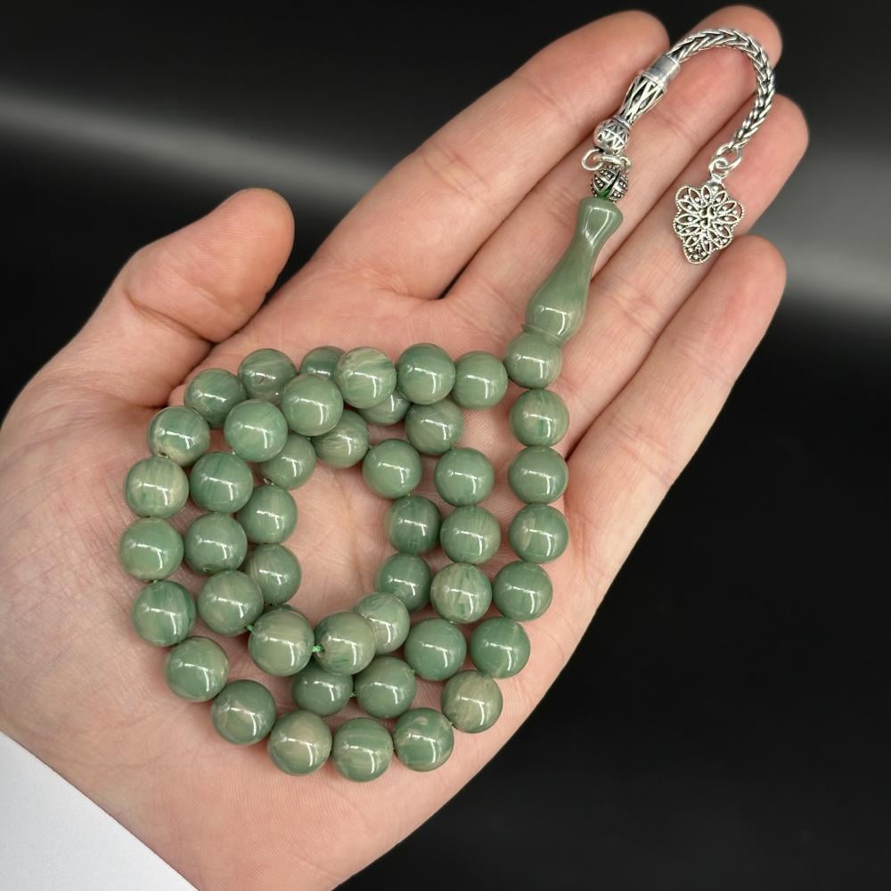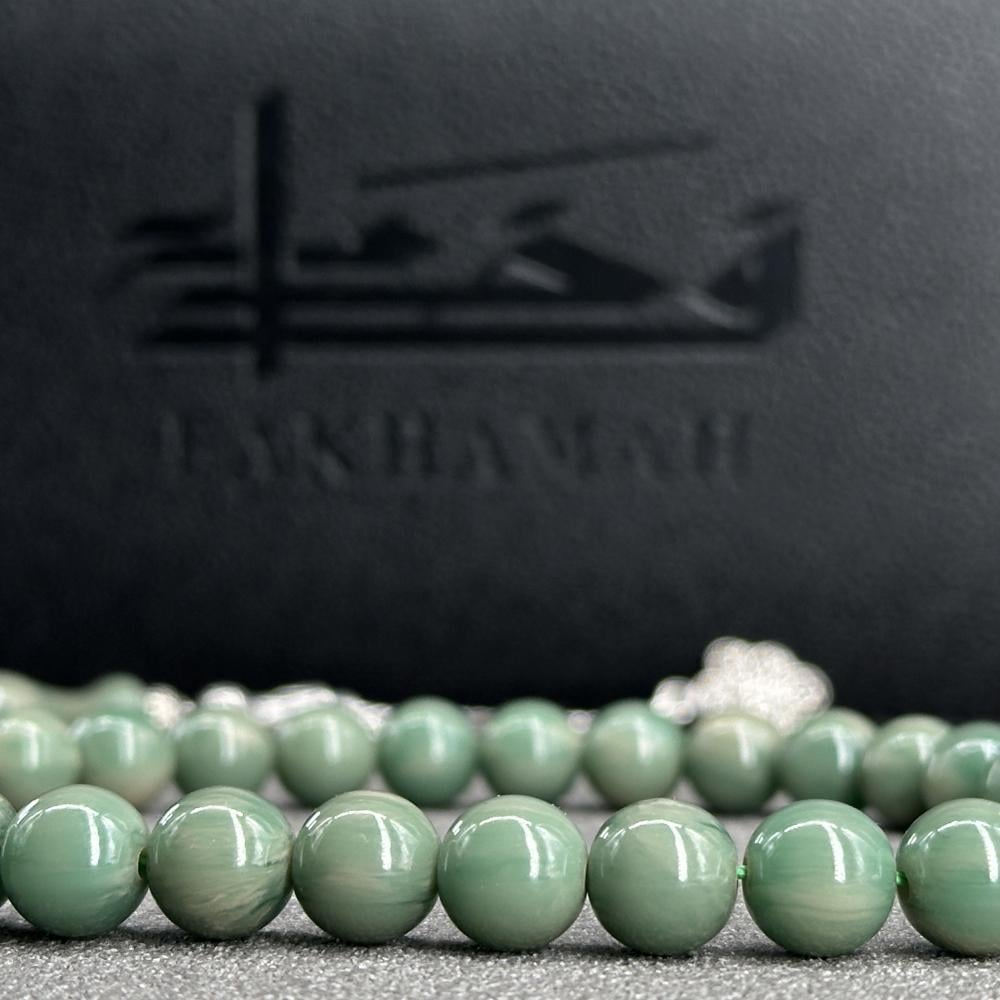 مسباح مسكي بدرجات اللون الأخضر الزمردي المعتّق بلمعان مصقول مع وزن خفيف يمنح راحة في الاستخدام اليومي. خراطة يدوية متقنة وحبّات دائرية بملمس ناعم؛ مع كركوشة فضة عيار 925 , قطعة راقية لعشّاق السبح وتليق بالإهداء مع تغليف فاخر.