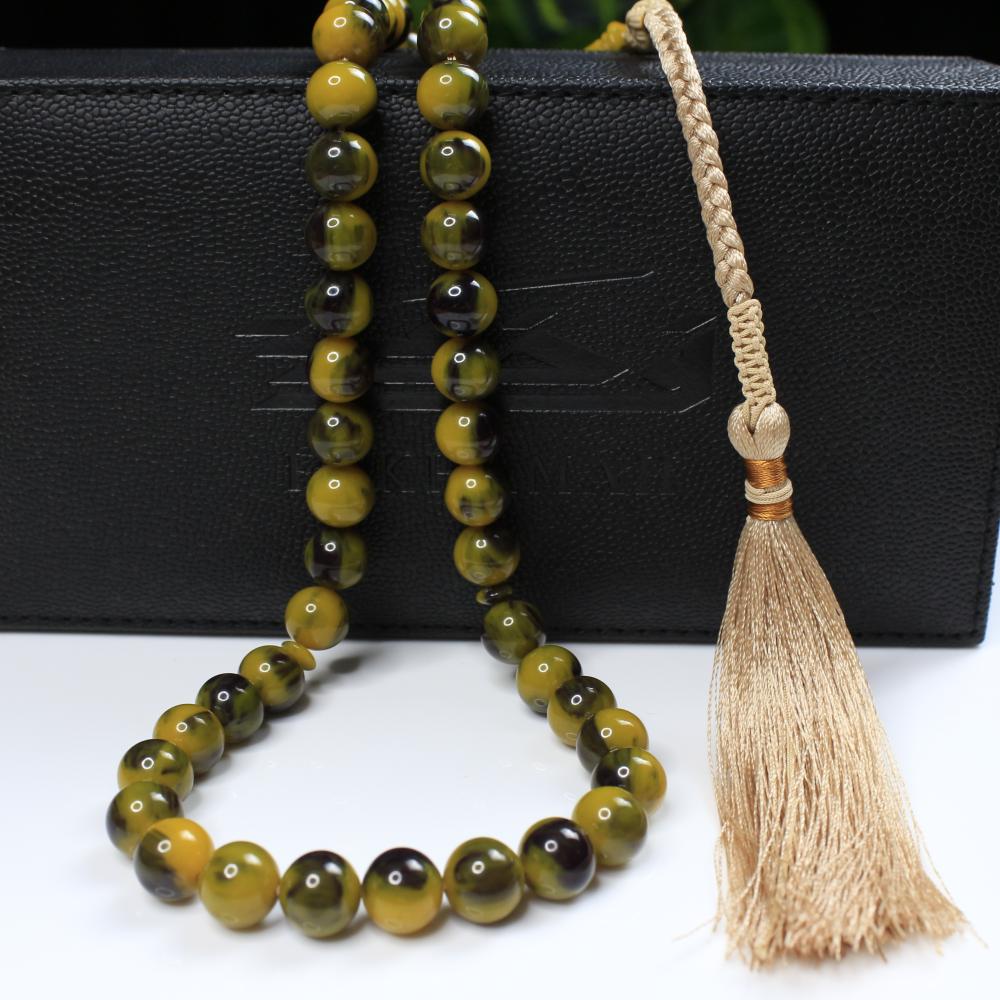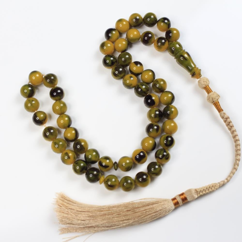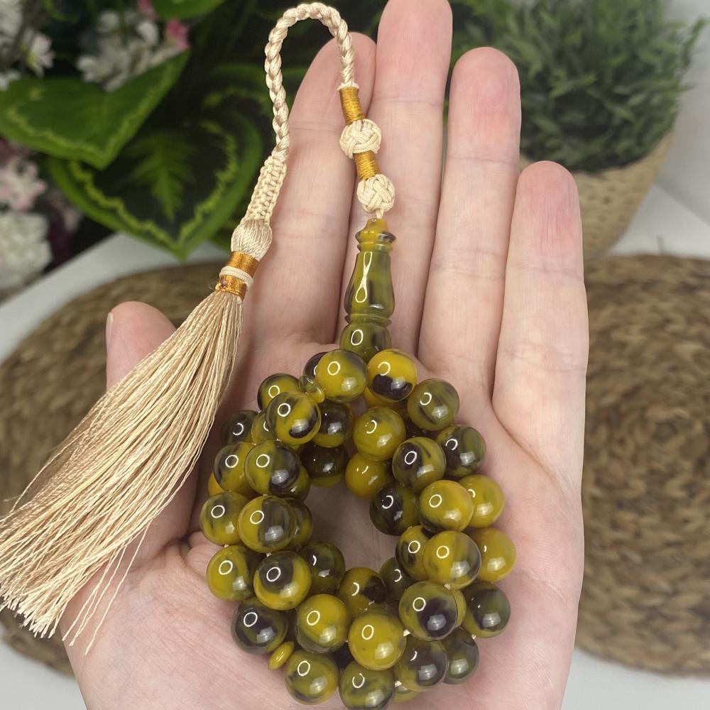 مسباح مسكي بدرجات تجمع الأخضر الداكن والزيتي ولمعان راقٍ يمنح عمقًا وهدوءًا بصريًا. خراطة يدوية متقنة وحبّات دائرية بانسيابية مريحة؛ قطعة أنيقة لعشّاق السبح وتليق بالإهداء والاقتناء.