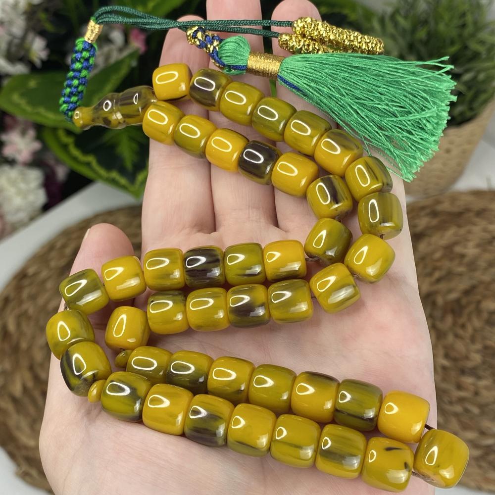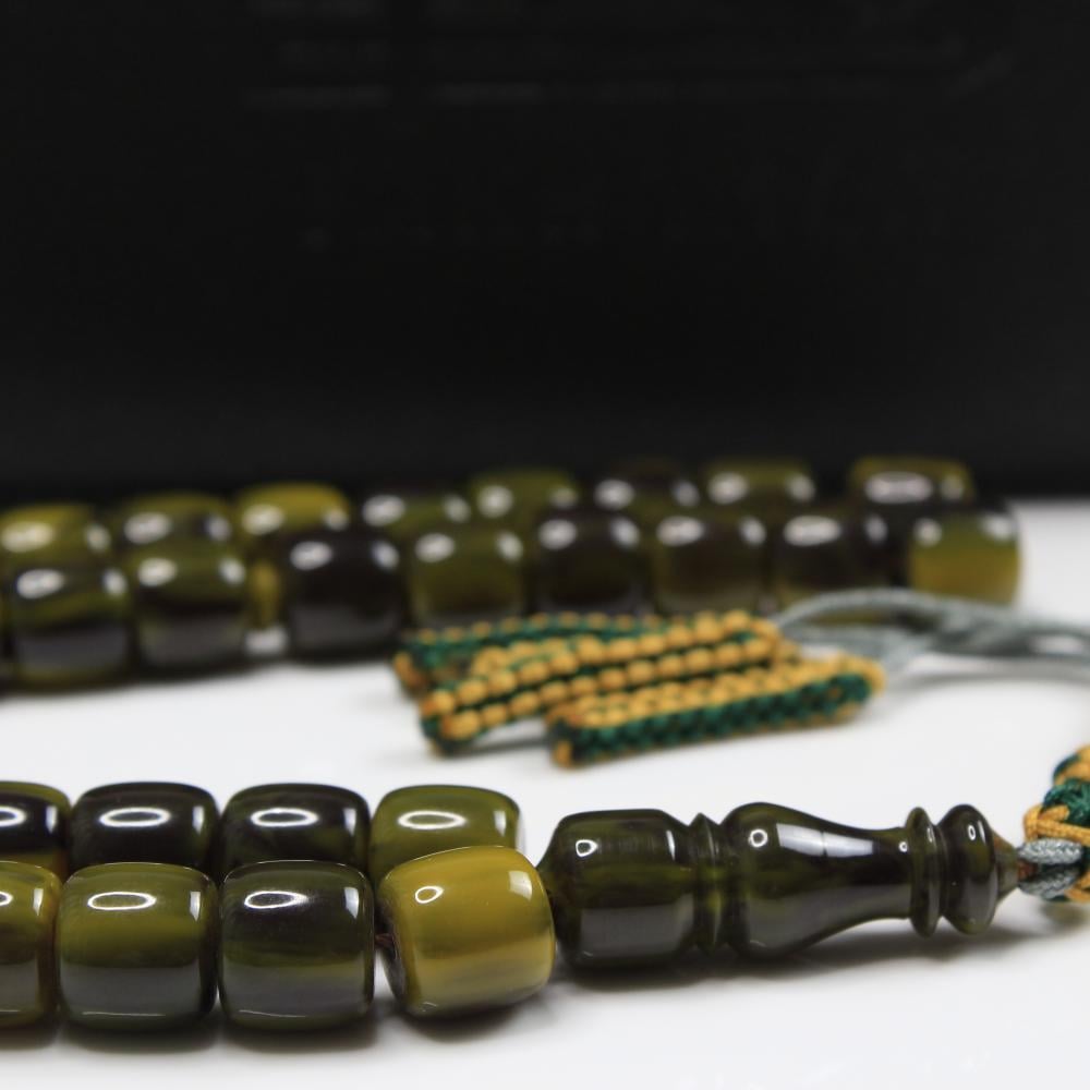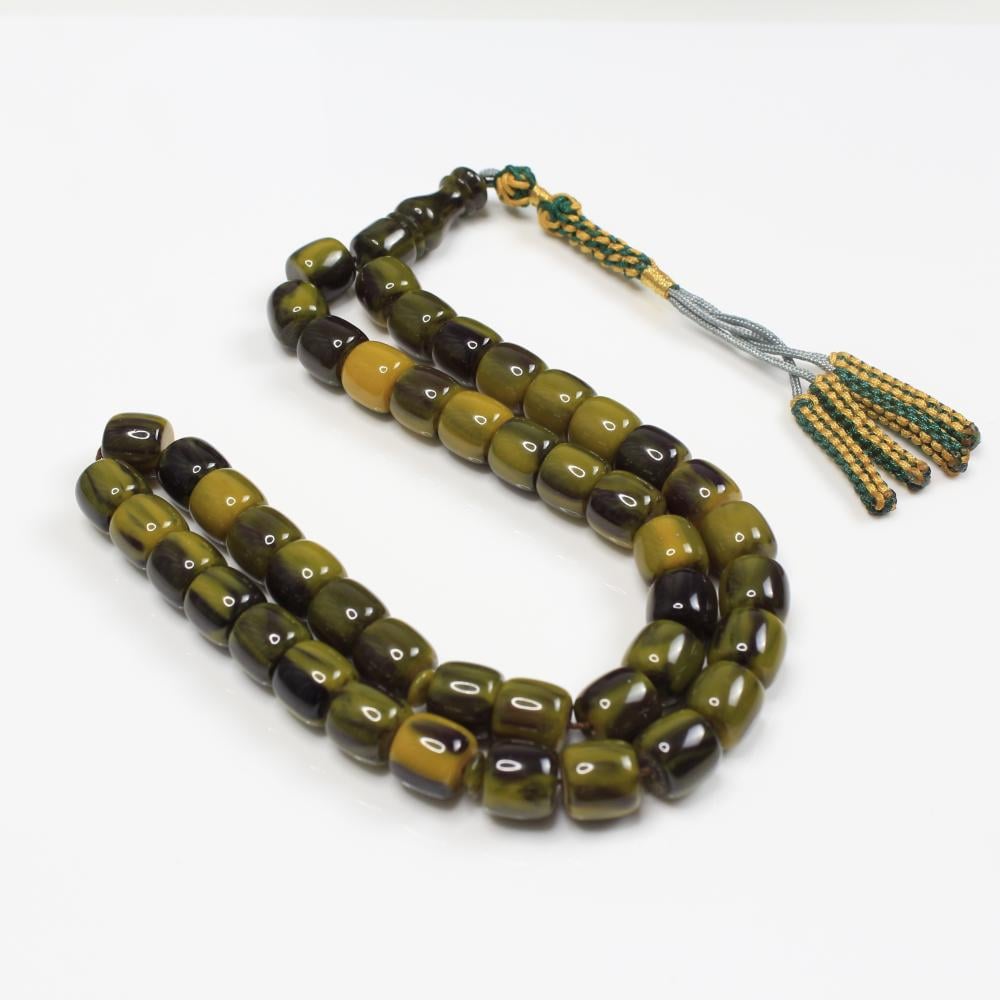 مسباح مسكي بدرجات تجمع الأخضر الهادئ والزيتي العميق ولمعان راقٍ يمنح عمقًا بصريًا. خراطة يدوية متقنة وحبّات أسطوانية بانسيابية مريحة؛ قطعة أنيقة لعشّاق السبح وتليق بالإهداء والاقتناء.