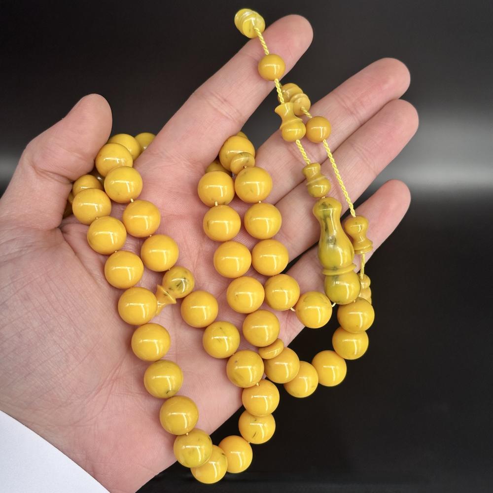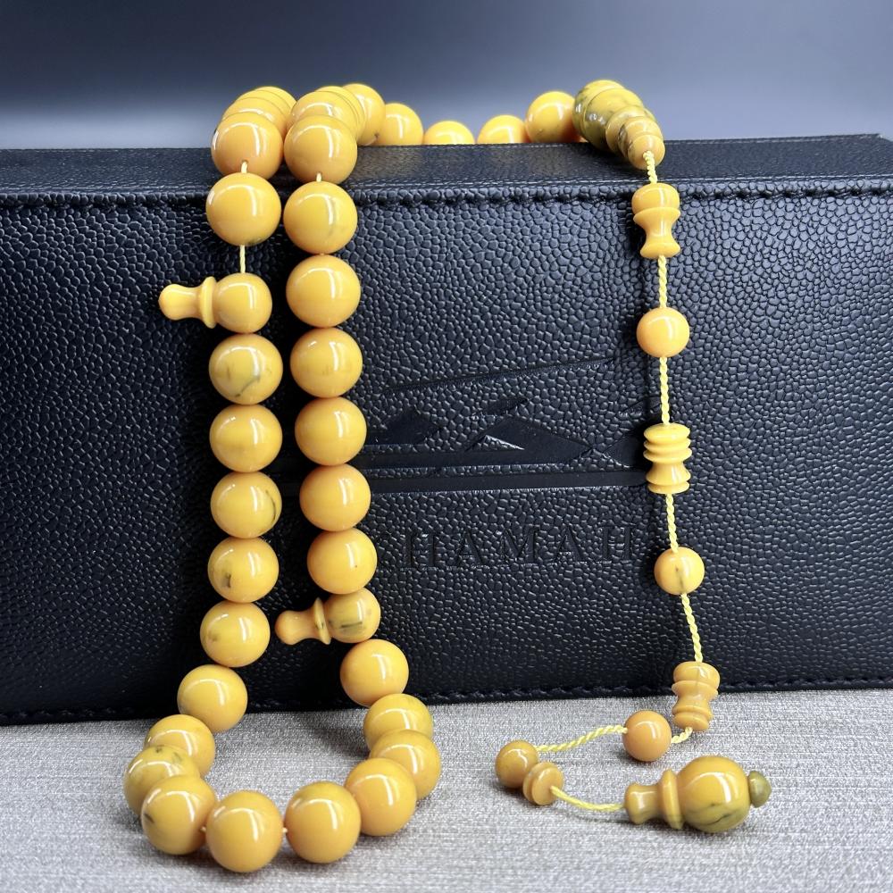 مسباح مسكي بدرجة أصفر ليموني ولمعان راقٍ يمنح دفئًا وهدوءًا بصريًا. خراطة يدوية دقيقة وانسيابية مريحة؛ قطعة أنيقة لعشّاق السبح وتليق بالإهداء والاقتناء.