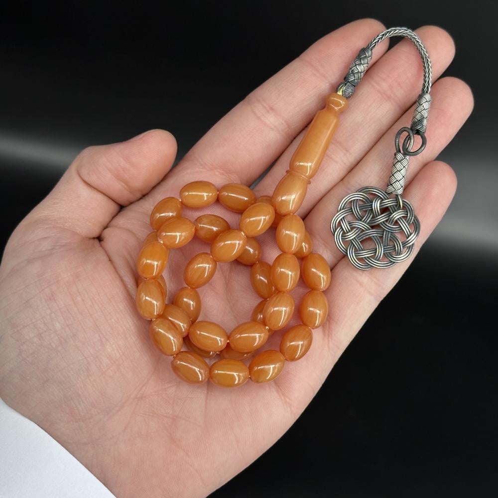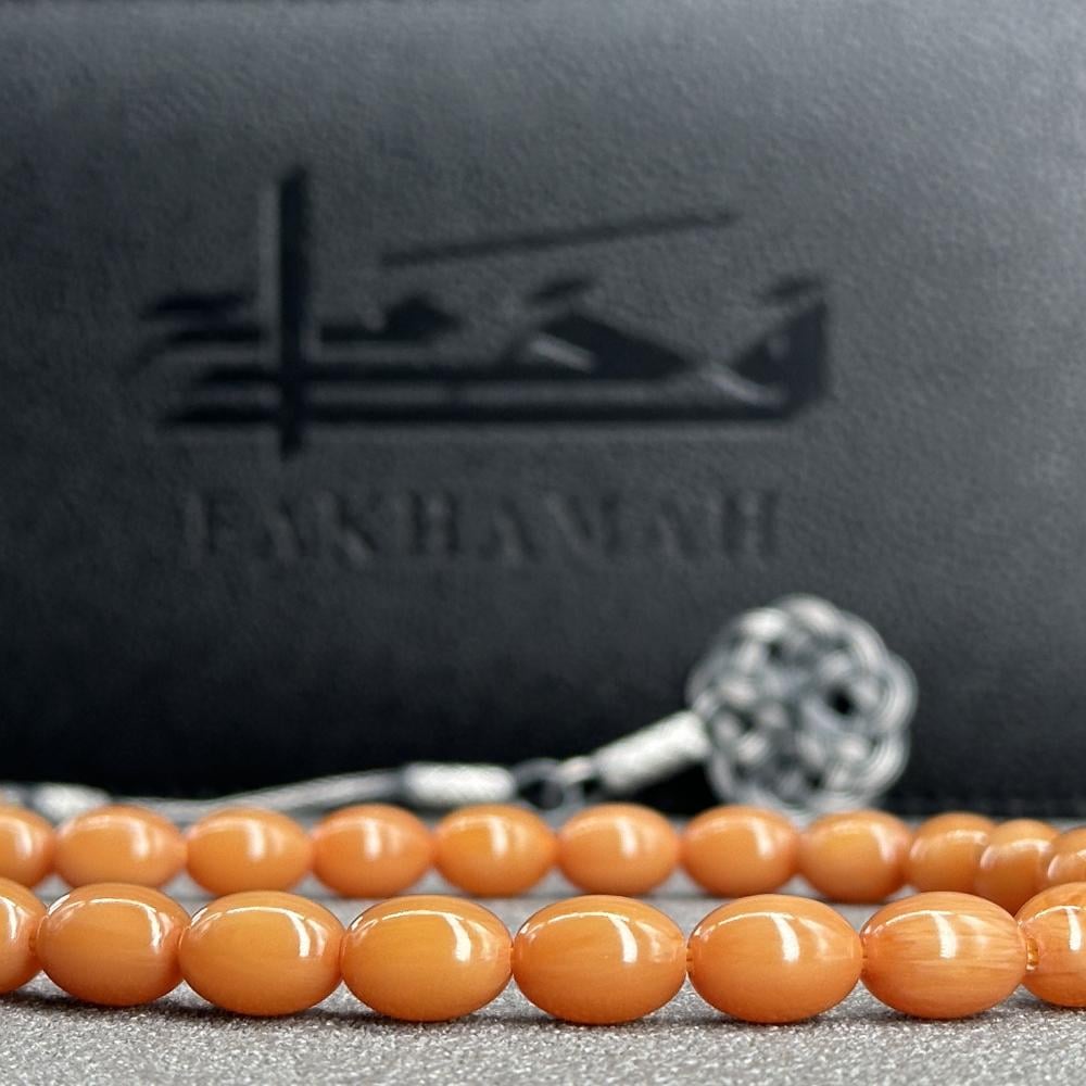 مسباح مسكي بدرجات اللون العسلي الكهرماني المعتّق بلمعان مصقول مع وزن خفيف يمنح راحة في الاستخدام اليومي. خراطة يدوية متقنة وحبّات بيضوية بملمس ناعم؛ مع طربزونة فضة عيار 1000 , قطعة راقية لعشّاق السبح وتليق بالإهداء مع تغليف فاخر.