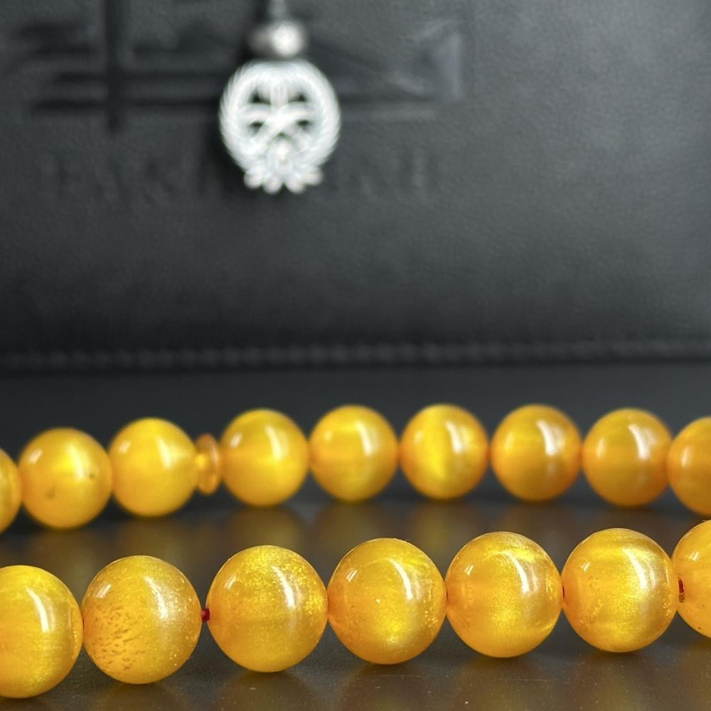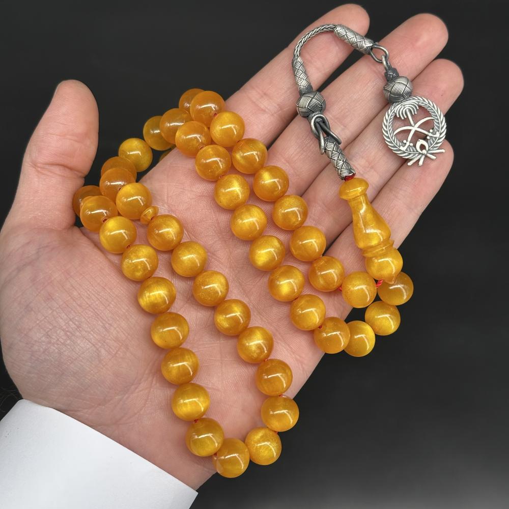 مسباح مسكي بدرجة عسلي فاتح شبه شفافة بتدرجات طبيعية تعكس الضوء بهدوء ولمعان مصقول أنيق. خراطة يدوية متقنة وملمس ناعم؛ مع طربزونة فضة عيار 1000 تحمل شعار المملكة ,قطعة راقية لعشّاق السبح وتليق بالإهداء والاقتناء.