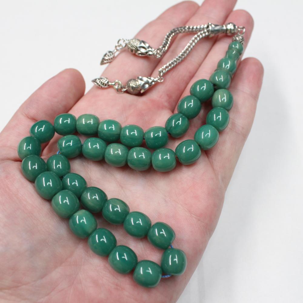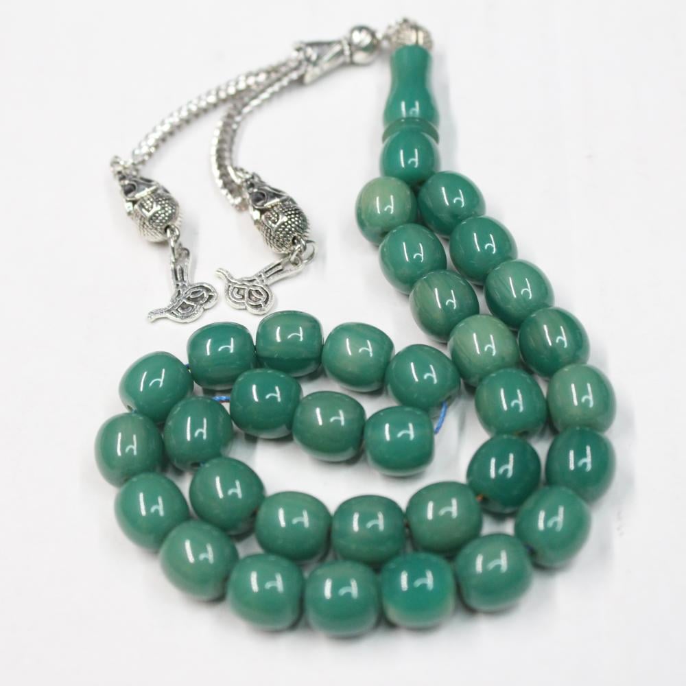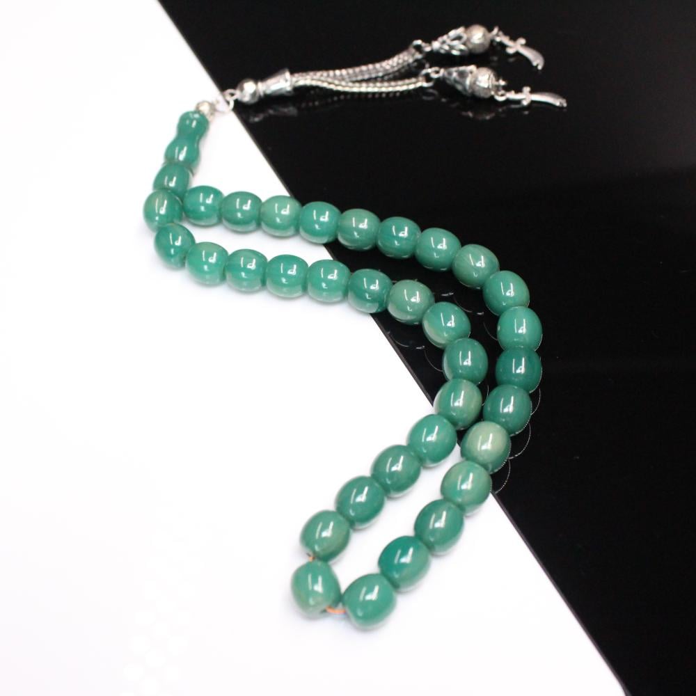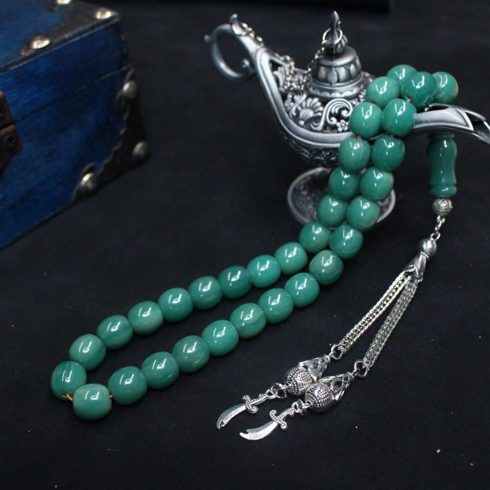 مسباح مسكي بدرجة أخضر معتّق ولمعان مصقول بوزن خفيف يمنح راحة في الاستخدام اليومي. خراطة يدوية متقنة وحبّات دائرية بملمس ناعم؛ قطعة راقية لعشّاق السبح وتليق بالإهداء مع تغليف أنيق.